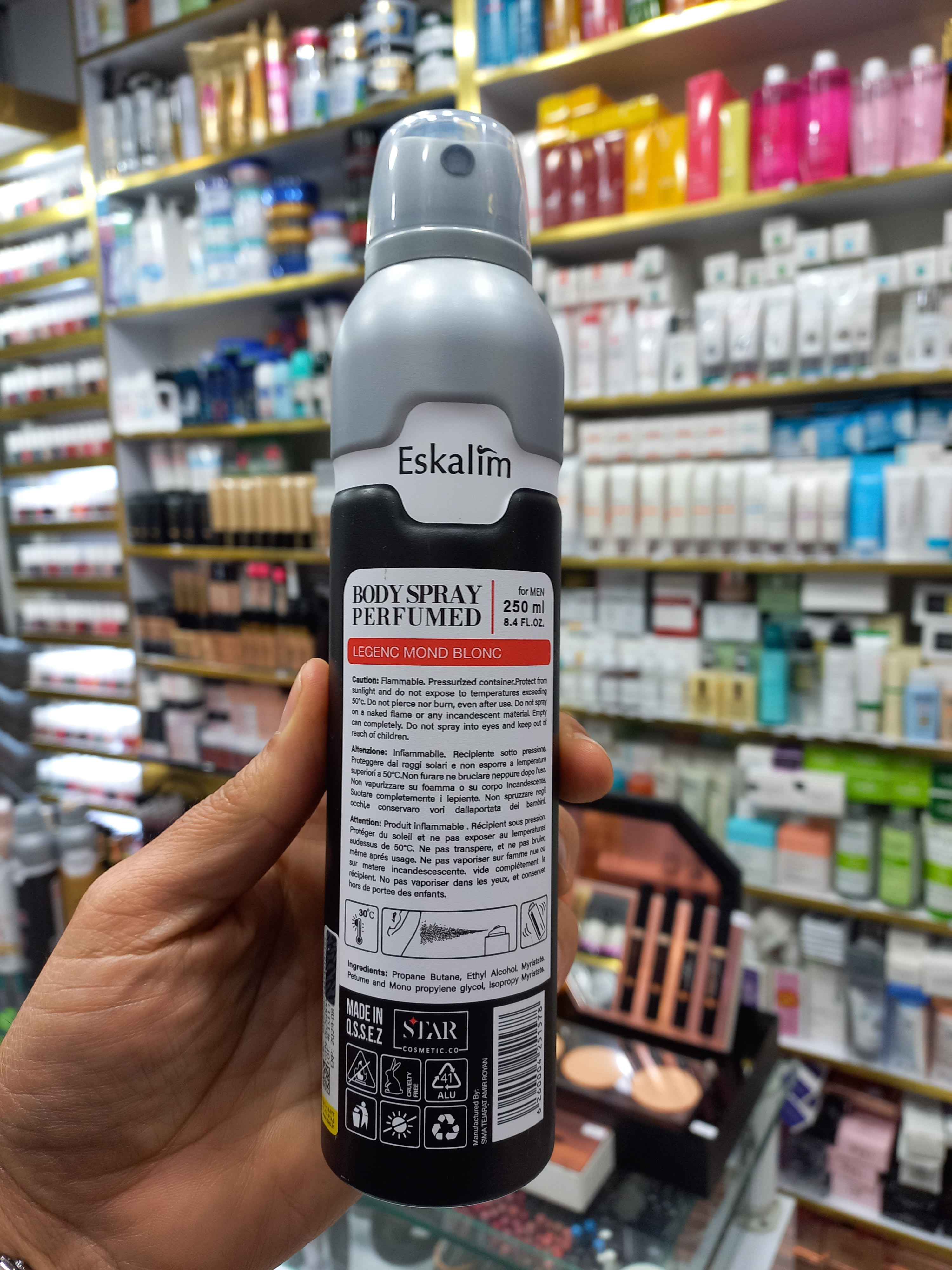 اسپری اسکالیم ۲۵۰ میل با رایحه «مونت بلنک لجند» یک بادی اسپری مردانه است که معمولاً بهعنوان خوشبوکننده بدن استفاده میشود و رایحهای الهامگرفته از عطر محبوب Montblanc Legend دارد. این نوع اسپریها در ایران بسیار متداولاند و برند اسکالیم (Eskalim) آن را با حجم ۲۵۰ میل عرضه میکند.